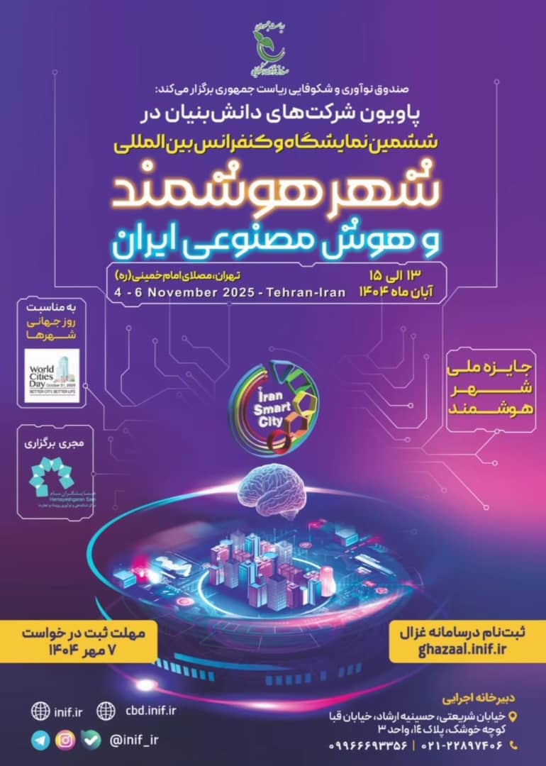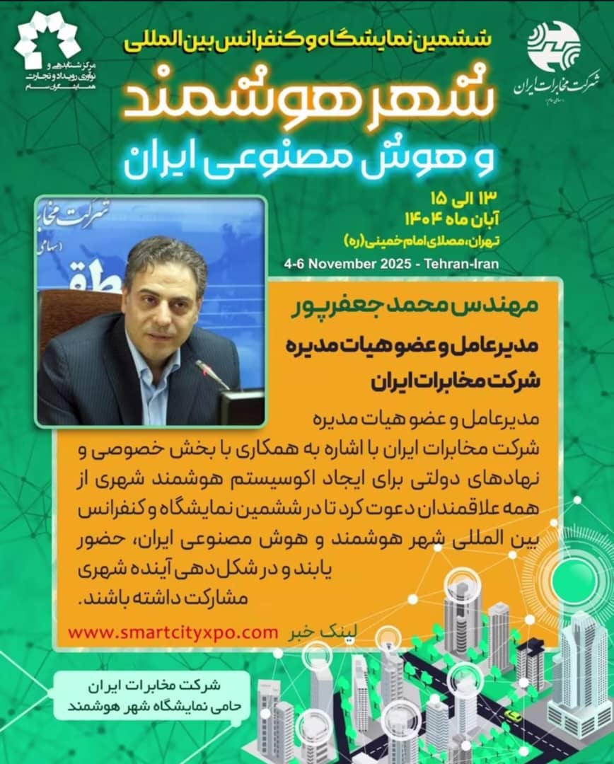 ششمین نمایشگاه و کنفرانس بینالمللی شهر هوشمند و هوش مصنوعی ایران، توسط مرکز شتابدهی رویداد و تجارت (شرکت همایشگران سام) و با حمایت مؤثر وزارتخانهها، سازمانها، بخش خصوصی و شرکتهای دانشبنیان، از ۱۳ الی ۱۵ آبان ۱۴۰۴ در محل نمایشگاههای مصلی تهران برگزار میشود.